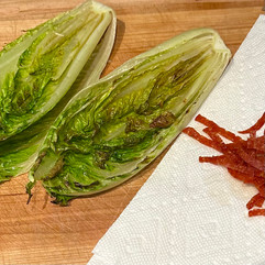 Wash, dry and cut a head of romaine in half, lengthwise. Drizzle with a bit of extra virgin olive oil. Set over a medium grill, cut side down. It will only take a minute or two to brown/char lightly. Remove from heat and set aside on a paper towel, to remove excess oil. Serve cut side up. Drizzle with blue cheese dressing and crispy crushed pieces of fried bacon, prosciutto, salami or pepperoni.