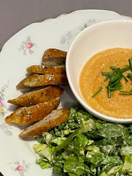 22.11.29 | Tuesday | Salmon benedict on potato "muffin", with blueberries on side | mixed green salad with crushed-toasted nuts and apple pieces | Caesar salad (see recipe from Sun dinner), homemade spicy cauliflower soup, fennel sausage slices. See pic below |